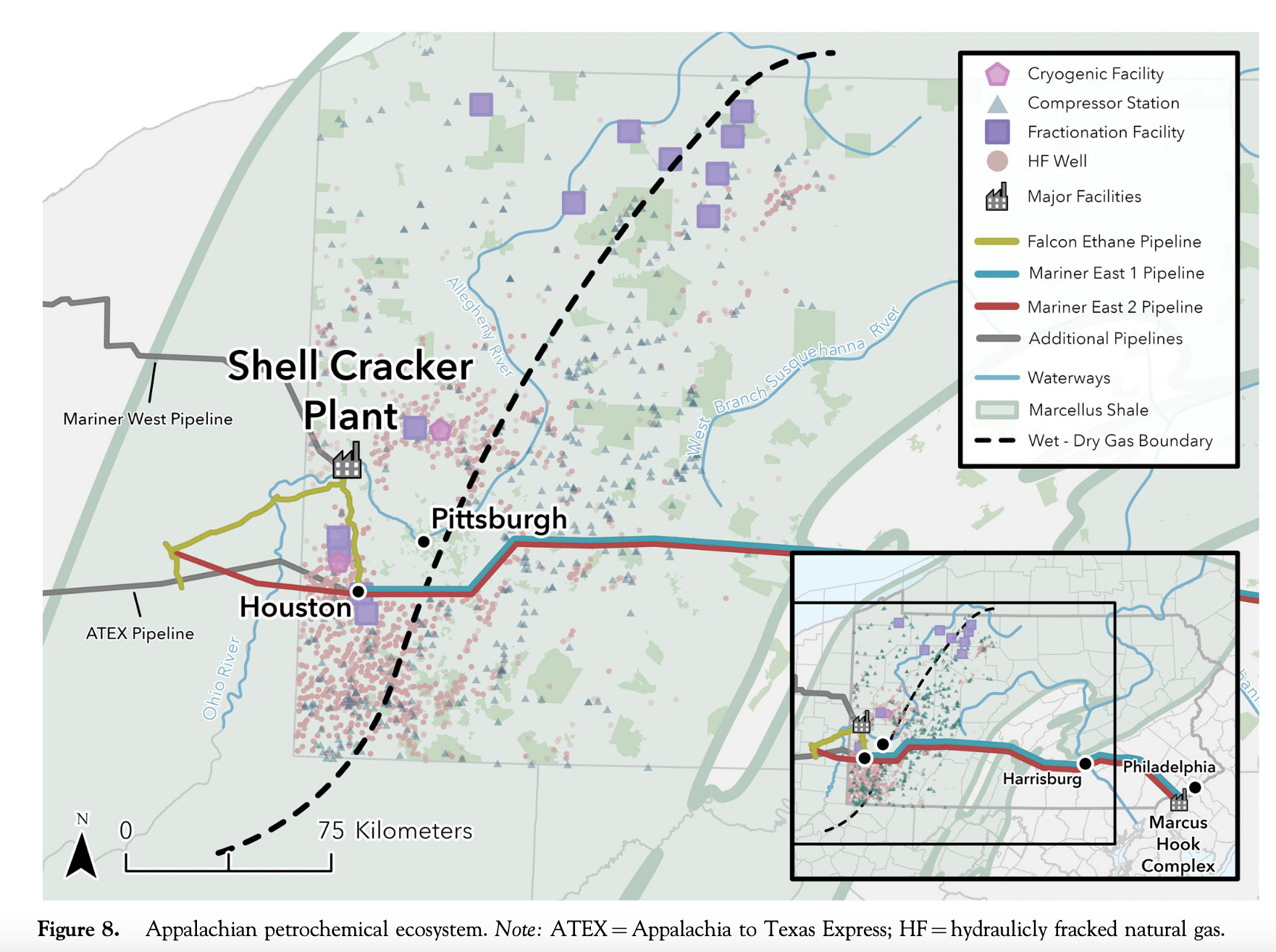 Dr. Baka's research combined quantitative and qualitative methodology to to illuminate the scale of Pennsylvania's petrochemical ecosystem, revealing over 20,000 sites of infrastructure. Theses sites include hydraulically fractured natural gas wells, compressor stations, pipeline inspection gauges, pump stations, natural gas processing facilities, pipelines, and export terminals. Some of these are large and conspicuous facilities that are easily identified, but others are small, making them harder to detect across the landscape.