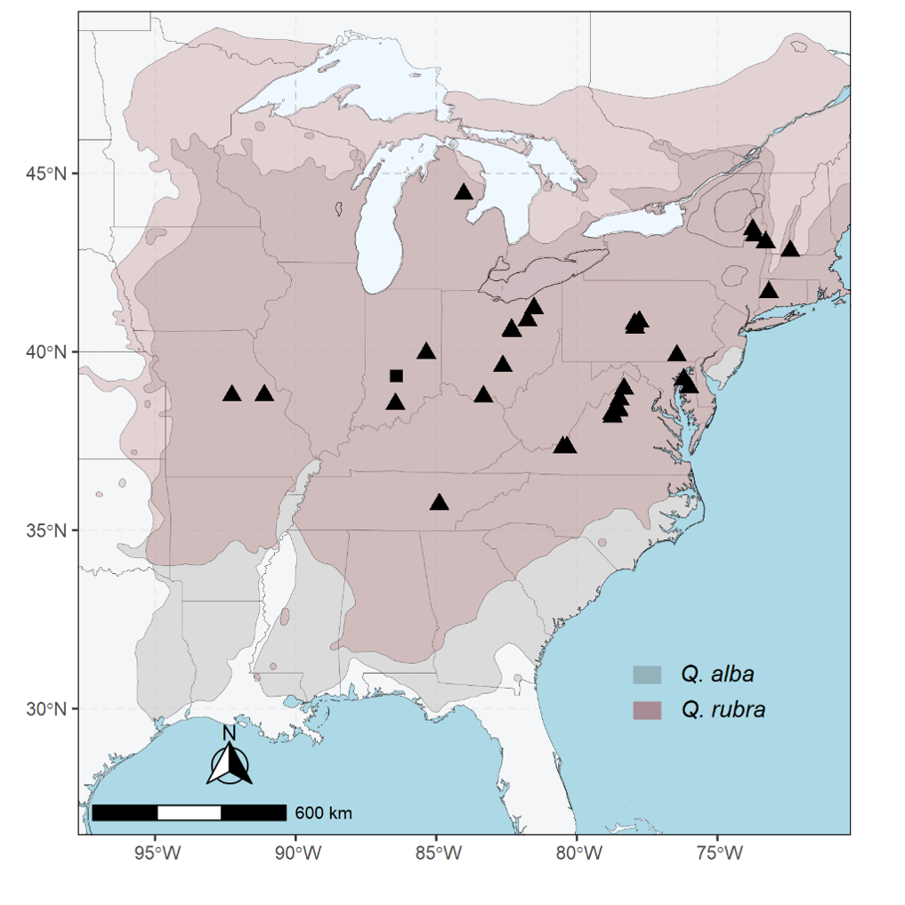 Lockwood, B. R., Maxwell, J. T., Denham, S. O., Robeson, S. M., LeBlanc, D. C., Pederson, N., ... & Au, T. F. (2023). Interspecific differences in drought and pluvial responses for Quercus alba and Quercus rubra across the eastern United States. Agricultural and Forest Meteorology, 340, 109597.