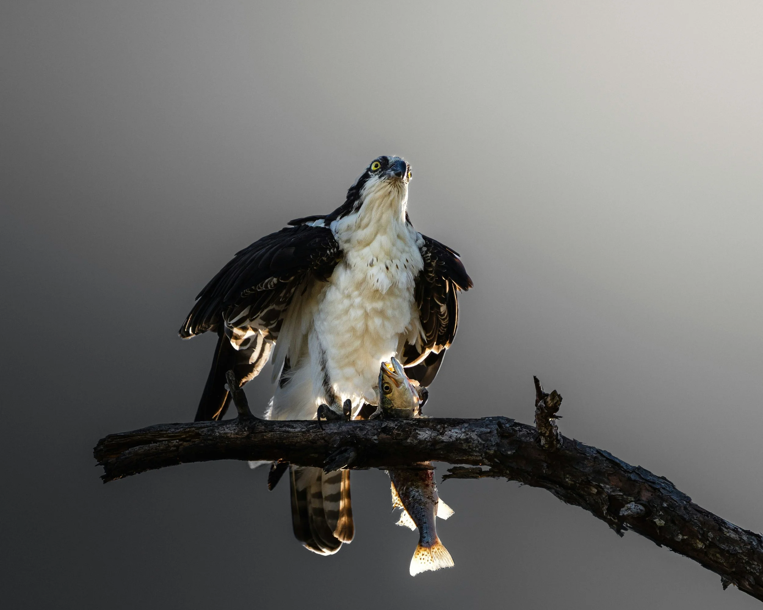 Osprey feeding on a fish on a tree branch. Photo by Dmytro Koplyk