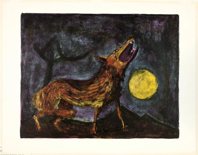 Through a gap in the barn wall a coyote’s amber eye tracks me. The feral gaze clashes with the smell of old hay and dust, the wild peering into the mundane. Marking the creature’s presence, I prowl across creaking boards to the nearly skeletonized buck and a fresher, though rapidly desiccating, wolf laying in the dusty straw. My gaze lingers on the buck’s antlers a moment, but there is no pull there. The rack I found three nights ago is more impressive, a full four points larger. So instead, I kneel by the wolf carcass.